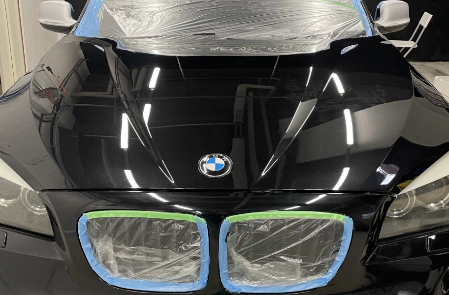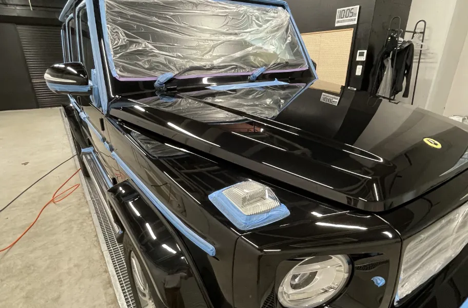 樹脂やゴム部分などに磨き剤がつくと素材を痛めてしまう恐れがあるため、ボディ拭き上げ後、磨き剤を使用する前に養生テープで保護します。また、研磨剤がガラスに付着したり、ボディの細部に入り込まないように、マスキングテープなどを使って養生します。